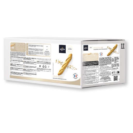 Mini Packs: Produkte, die zur einfachen linearen Anordnung und garantierten Warenrotation in kleinen weißen Kartons verpackt sind, mit großen farbigen Etiketten für leichtes Verständnis und Übersichtlichkeit. Ein ikonisches Mini Baguette mit Eleganz und Finesse, das aus Weizensauerteig hergestellt wird. Bei der Verkostung entfalten sich leicht saftige Noten und eine schmelzende Textur dank den Weizenkeimflocken, die im Rezept enthalten sind.