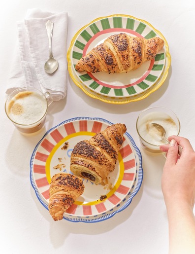 Ein schönes, goldglänzendes Croissant mit Kakao-Nuss-Füllung, die großzügig über das gesamte Croissant verteilt ist. Eine wahre Gaumenfreude! Ein Topping aus Schokoladenstücken für einen leicht erkennbaren Geschmack.