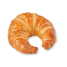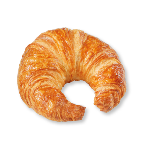 - Ein gebogenes Croissant aus reinem Butter-Plunderteig mit regelmäßiger Blätterung und einer zartschmelzenden Textur.