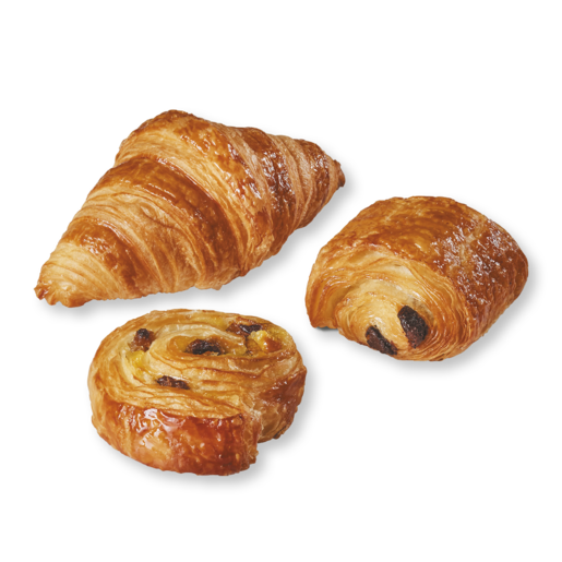 Rosinenschnecke: Wasser, WEIZENMEHL, Rosinen 14%, feiner Butter (MILCH) 13%, Zucker, EIER, modifizierte Stärke, Hefe, Molkenpulver (MILCH), Salz, WEIZENGLUTEN, MAGERMILCHPULVER, Stabilisatoren (Calciumacetat, Dinatriumphosphat, Tetranatriumdiphosphat), Natürliches Aroma, Baumwollsamenöl, ungehärtetes Rapsöl oder Sonnenblumenöl, Karottenextrakt, Kurkuma-Extract, Paprikaextrakt, Mehlbehandlungsmittel (Alpha-Amylasen, Ascorbinsäure, Hemicellulasen). Schokobrötchen: WEIZENMEHL, feiner Butter (MILCH) 20%, Wasser, Schokolade 12,3% (Zucker, Kakaomasse, Kakaobutter, Emulgator (SOJALECITHIN), Natürliches Vanillearoma), Hefe, Zucker, EIER, Salz, WEIZENGLUTEN, Mehlbehandlungsmittel (Alpha-Amylasen, Ascorbinsäure, Hemicellulasen). Croissant: WEIZENMEHL, feiner Butter (MILCH) 23%, Wasser, Hefe, Zucker, EIER, Salz, WEIZENGLUTEN, Mehlbehandlungsmittel (Alpha-Amylasen, Ascorbinsäure, Hemicellulasen). Kann Spuren enthalten von: Sesamsamen, Schalenfrüchten.
