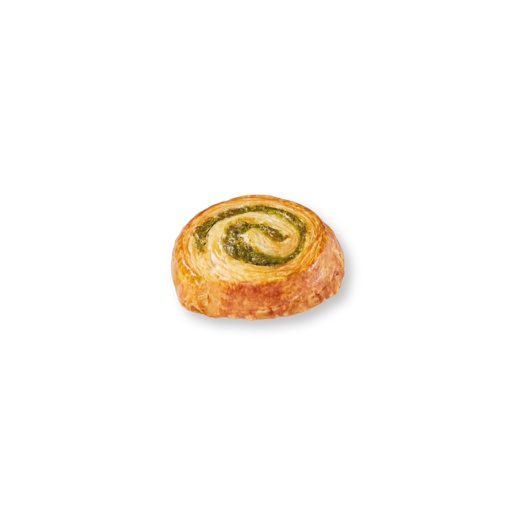 Eine 30 g Mini-Schleife aus sehr knusprigem Blätterteig mit einer cremigen Pesto-Füllung.