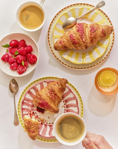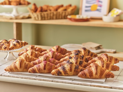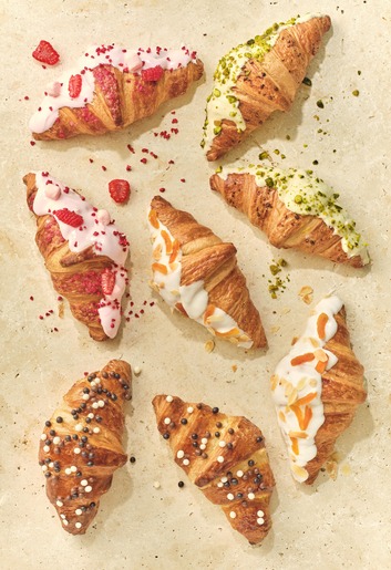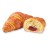 A generously sized (90 g) shiny, golden-brown croissant, with a deliciously fruity raspberry filling and pink sugar topping. The filling is evenly distributed throughout the croissant.