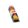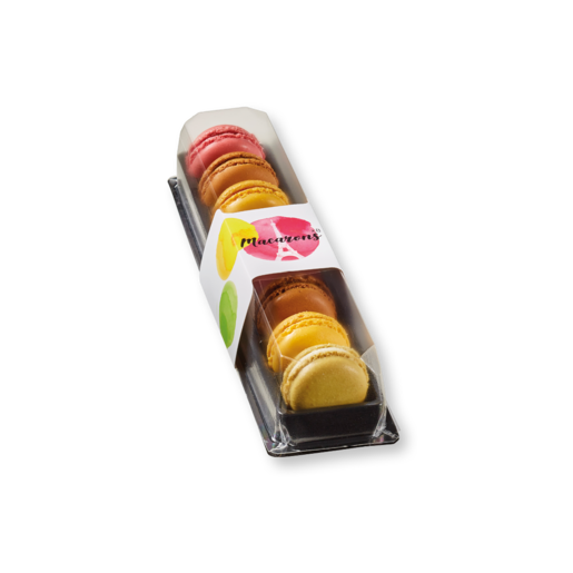 A blister pack of delicious macarons with trendy flavours: Chocolate, Pistachio, Vanilla, Raspberry.