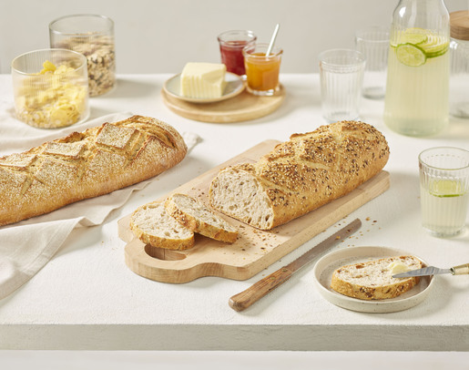 Un grand pain aux graines, riche en saveurs grâce à un subtil mélange de sésame, lin brun, lin jaune, flocons de blé et tournesol.
