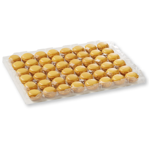 Macaron au citron (sucre, blanc d'ŒUF, beurre Charentes-Poitou AOP (LAIT), AMANDES en poudre, crème anglaise (LAIT entier, sucre, jaune d'ŒUF, amidon, protéines de lactosérum, arôme naturel de vanille, colorant (bêta-carotène d'origine naturelle), graines de vanille épuisées), garniture citron 5% (pulpe de citron 2%, sucre, jus de citron, épaississant (pectine), huile essentielle de citron 0,005%), fécule de pomme de terre, colorant (lutéine)). Peut contenir des traces de: autres fruits à coque, soja.
