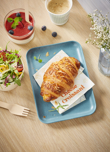 Le croissant fourré fromage SelectBlend est fabriqué avec une Matière Grasse Composée (MGC). Ce mélange, qui associe 90% de margarine à 10% de beurre concentré* a été conçu pour offrir un beau feuilletage et un goût équilibré. *sur la matière grasse