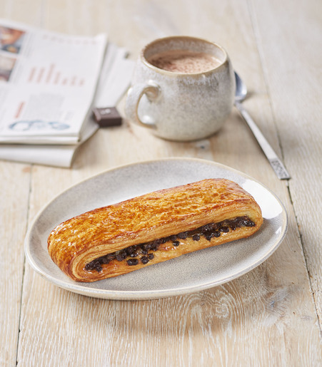 Una deliziosa pasta per croissant ripiegata su uno strato di crema pasticcera e ricoperta di gocce di cioccolato.